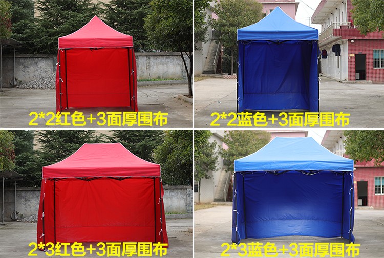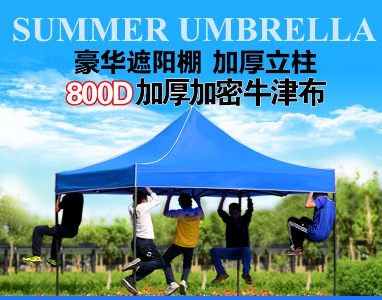 日よけ棚アウドアベレージの広告が屋台を広げています。屋台が伸びて日傘が伸びています。折り畳みの四角い傘が移動します。